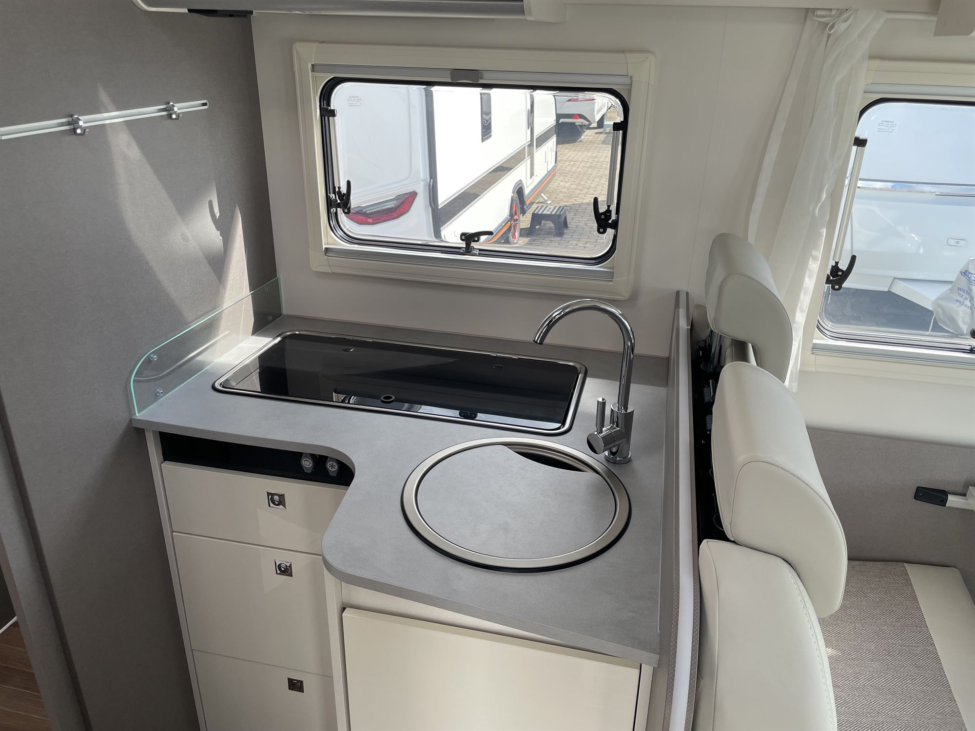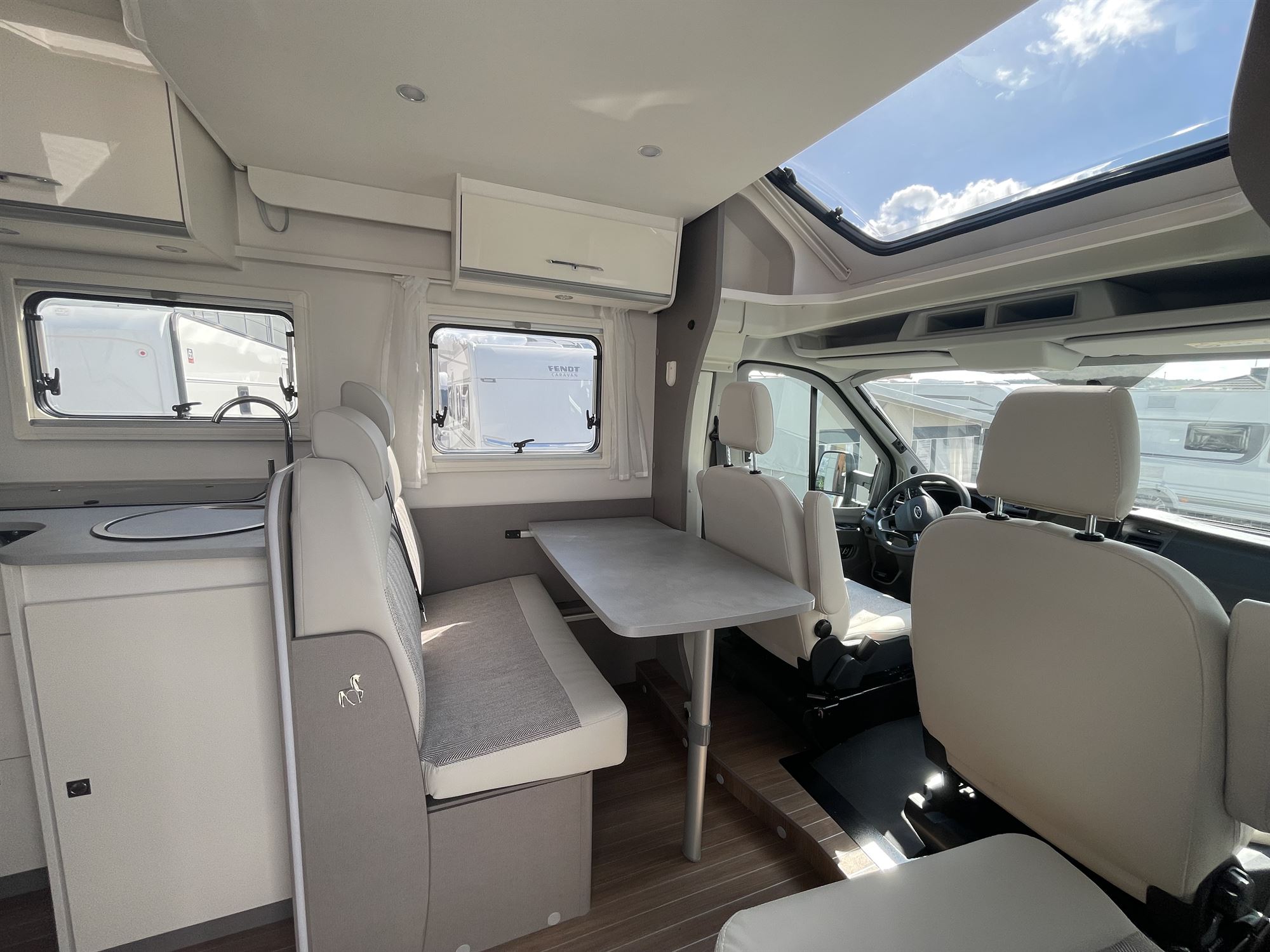 🌬️ Kabine soltag for godt lysindfald, markise, plissegardiner i førerkabinen for komfort og privatliv.